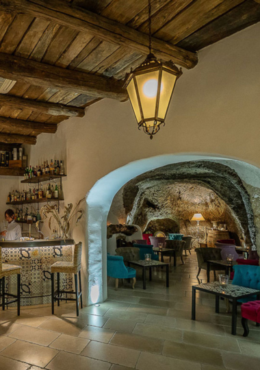 In una grotta naturale scolpita nella pietra tufacea, il bar La Grotta offre l’atmosfera perfetta per approfondire la conoscenza dei cocktail del Botania Relais accompagnato da un barman esperto.